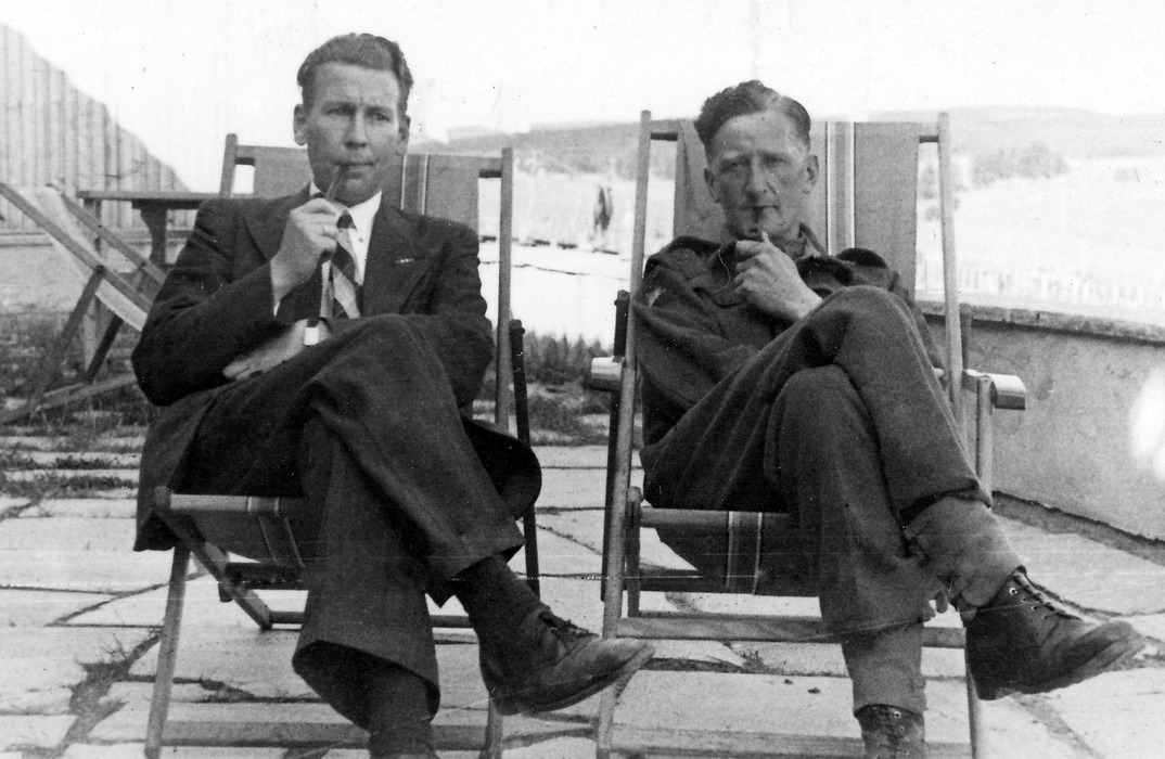 5. Tannlege og amatørfotograf Arne Frostad, til venstre, dokumenterte frigjøringsvåren i Nes. Her i en avslappet stund sammen med løytnant Scott fra de skotske troppene som inntok Runni leir i maidagene 1945.