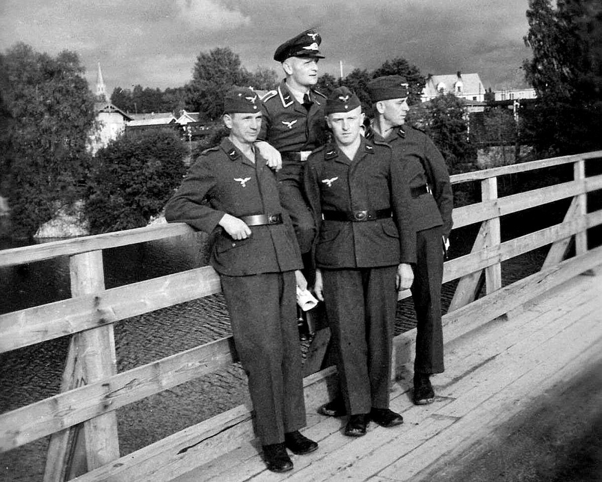 3. En gruppe tyskere fra Runni leir på den midlertidige gangbroen etter sprengningen av Årnes bro 11. april 1940.