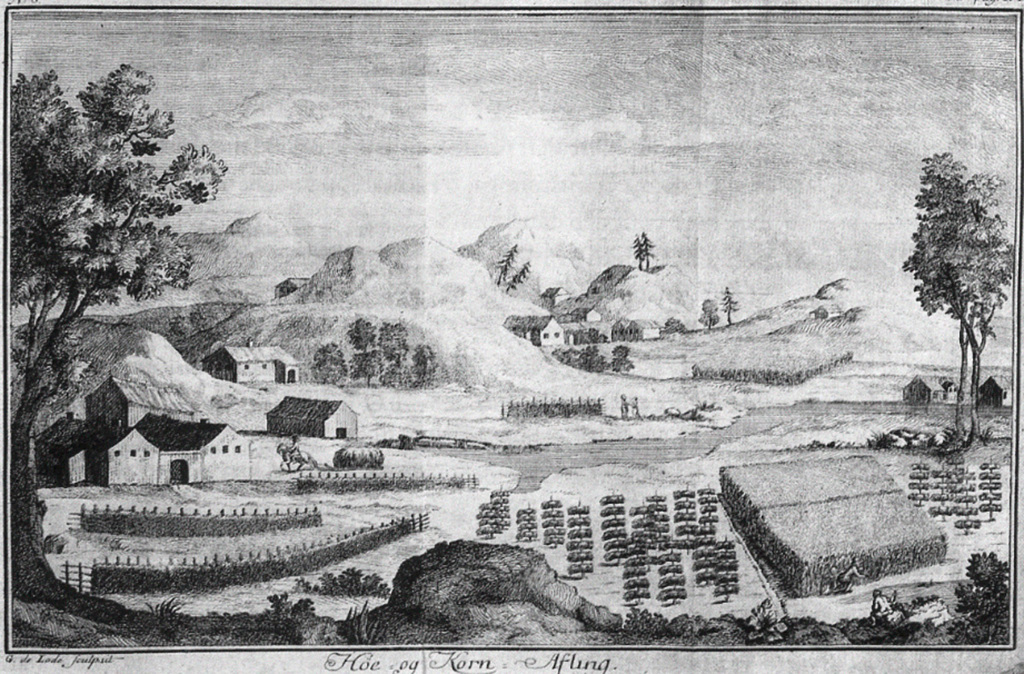 Det såkalte hamskiftet førte til grunnleggende økonomiske, sosiale og kulturelle omveltninger. Bildet viser høy og korndyrking i Norge på 1700-tallet. (Illustrasjon fra Erik Pontoppidans «Norges naturlige historie» fra 1752).
