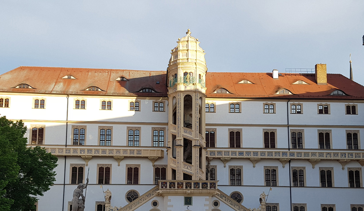 Byvandring i Torgau med Schloss Hartenfels i bakgrunnen, og statuer og fontene på torget.