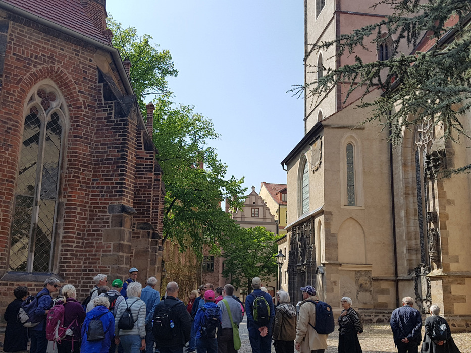 Så videre til Wittenberg, og byvandring til Schlosskirche med «tesedøren». En blir litt andektig av å være omtrent der reformasjonen startet, historien kommer veldig nær da. Byvandring videre forbi statuen av Johannes Bugenhagen, Luthers høyre hånd, og et besøk i Wittenberg 1517, som viser dagliglivet på Luthers tid.