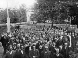 Bildene viser Romerike Historielags logo med Raknehaugen, og mange av dem som møtte på Jessheim 1. august 1920.